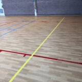 Renovatie bestaande Junckers sportvloer uit 1990 met behoud van vlakverend karakter door deze te voorzien van nieuwe pvc toplaag.